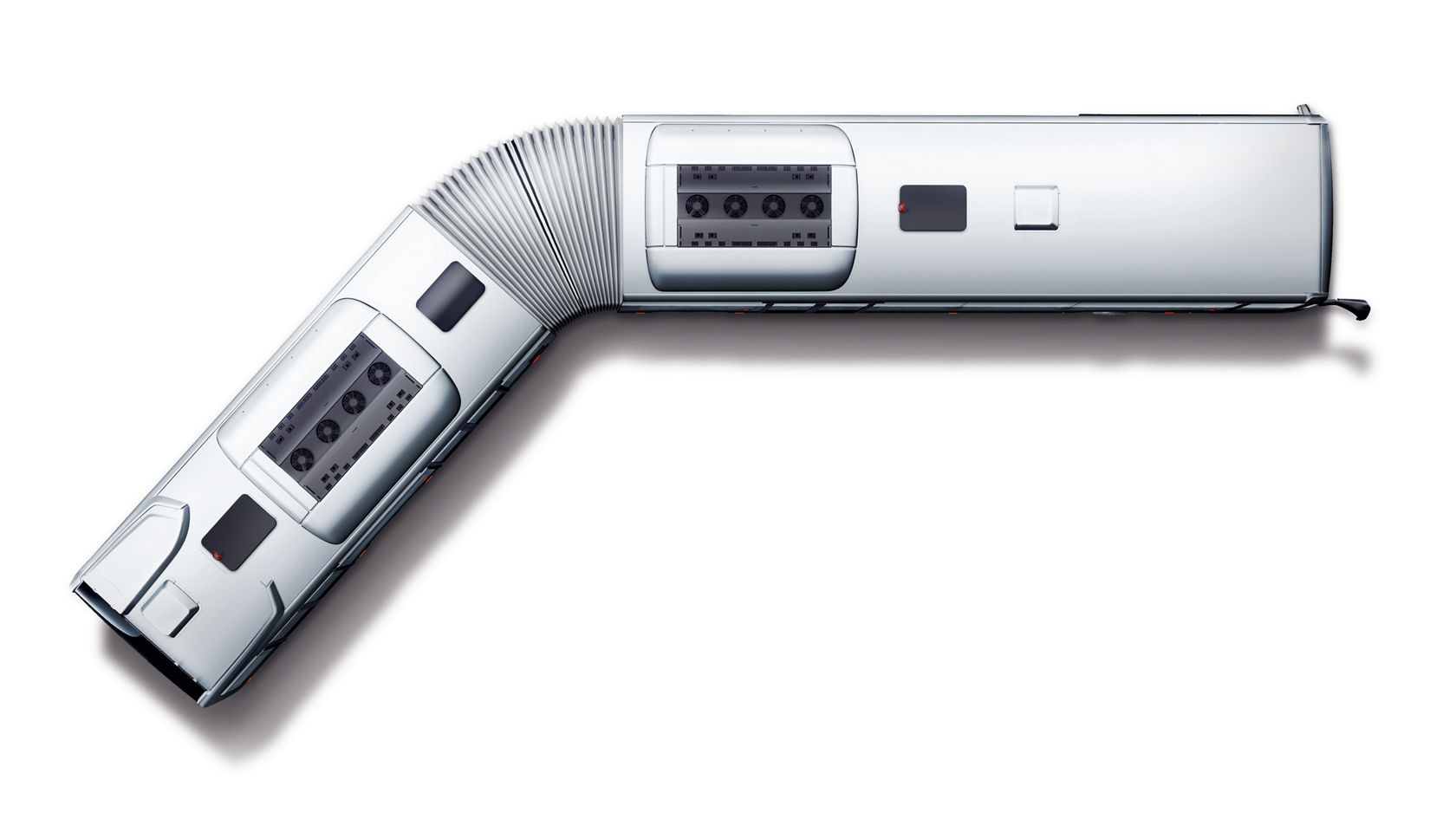 Front and rear carriage of the Citaro GÜ are joined by a tried-and tested low-floor articulation. The maximum articulation angle is 54 degrees. The ATC (Articulation Turntable Controller) developed by Mercedes-Benz sets a new standard for driving dynamics and safety. It controls the hydraulic damping of the demand-oriented articulation depending on (among other things) steering angle, angle, speed and load. The result is convincing: while the conventional damping of the articulation leads to strong tendency to understeer in curves and higher tyre wear, the articulation of the Citaro GÜ is almost free in a normal stable driving situation. Damping is only through the friction of the component elements.