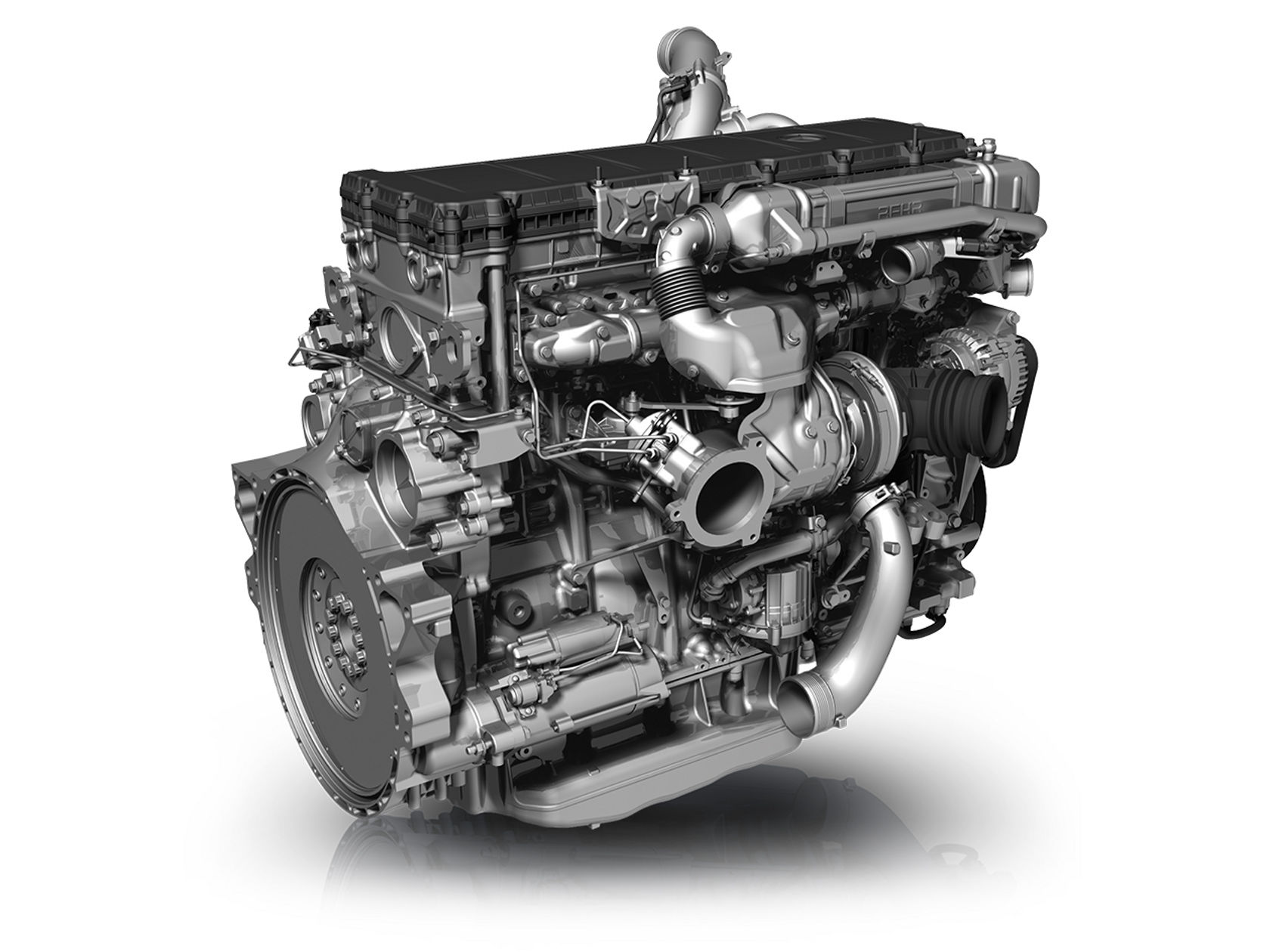 Mercedes-Benz OM 936 BlueEFFICIENCY Power engine, vertical six-cylinder in-line engine, Euro VI exhaust gas category with 7.7 litres displacement. Output: 260 kW (354 hp) at 2200 rpm. The corresponding torque is 1400 Nm. The engine features common-rail injection. The injection pressure is generated by a high-pressure pump.