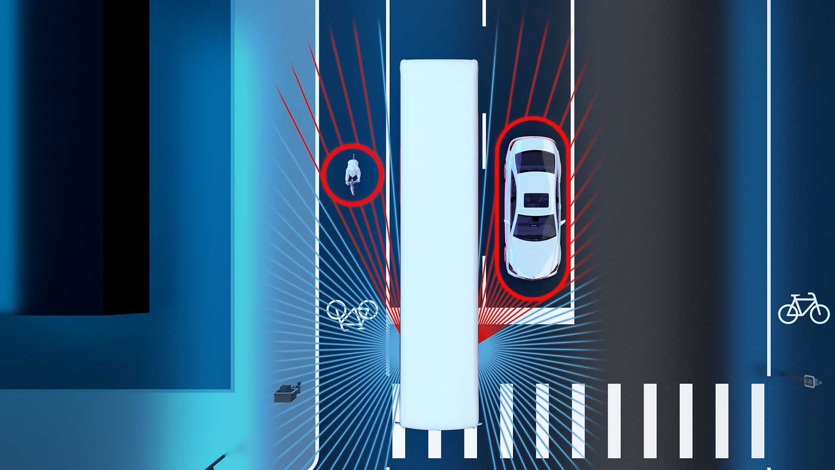 The side areas of the vehicle are constantly monitored. As a result, vehicles, pedestrians or cyclists who may be in the blind spot are detected on both the front passenger side and the driver’s side. The radar system precisely detects the movements and warns the driver of possible collisions. The intuitive user interface and clear warnings allow the driver to drive safely and relaxed.